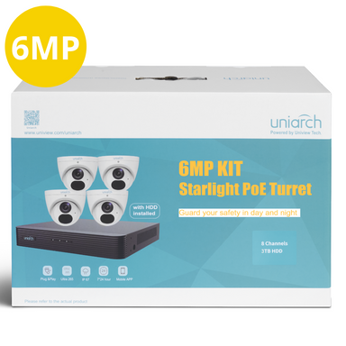 Part number KIT-UNA-8063W In the box: 4 x Uniarch 6MP Starlight Fixed Turret Network Camera IPC-T1E6-AF28K, 1 x 8ch NVR-108X-P8 with 3TB HDD ins...